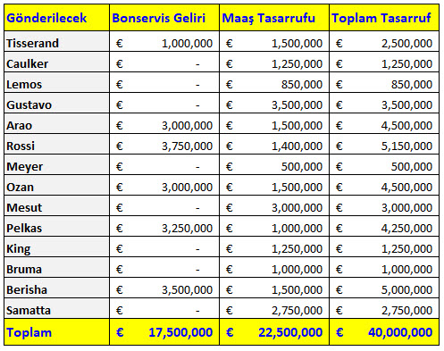 Öncelikle birinci tabloda gösterilen 14 oyuncu ile yollar hemen ayrılmalıdır. Bazı oyunculardan bonservis geliri sağlayabilecekken, bazı oyunculardan bonservis talep etmeden sadece maaş yükünden kurtulmak için gönderilmelidir. Hatta yüksek maaşları sebebiyle kulüp bulmakta zorlanan bazı oyuncuların maaşlarının %25’lik kısmını Fenerbahçe ödemeye razı olmalıdır.