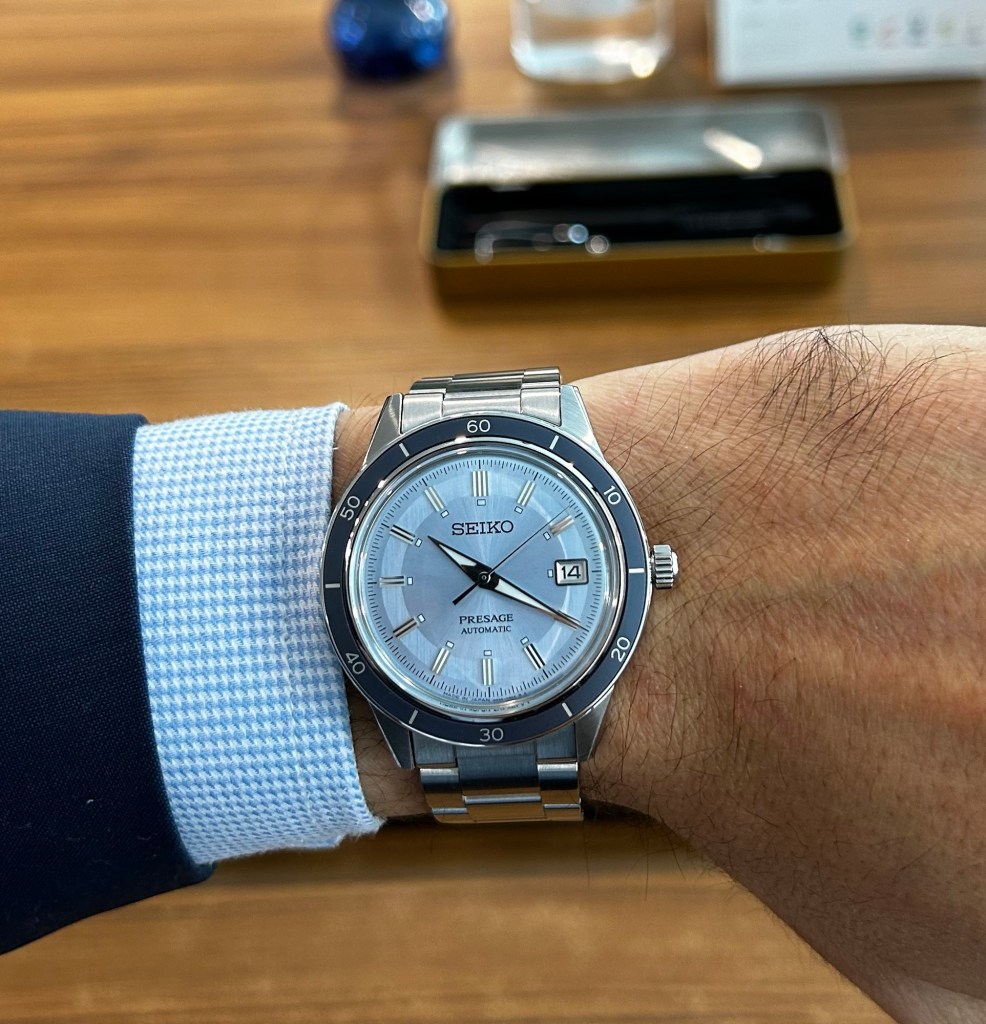 Seiko’nun Presage Style60’s serisi 60’lı yılların sportif-klasikliğinden ilham alıyor. Retro Blue olarak adlandırdıkları buz mavisi kadrana lacivert bezel eşlik ediyor. İndeksler ise Presage serisine yakışır şekilde klasik bir tasarıma sahip. Kadran tasarımı klasik olmasına rağmen bezeli ve spor çelik bileziği sayesinde bu saat hem dress watch hem de everyday watch kategorisine giriyor. Hem takım elbiselerimle hem de hafta sonu eşofmanla dahi kullanabiliyorum.